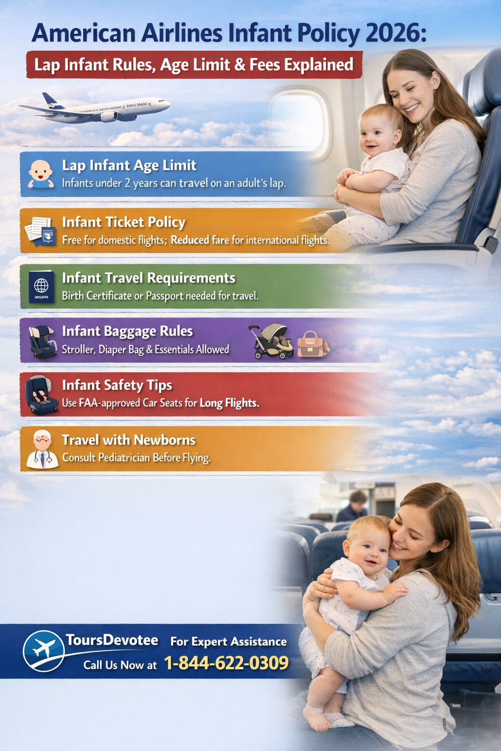 Understanding the latest American Airlines infant policy 2026 is essential for parents planning air travel with newborns or toddlers. Whether you are booking domestic or international flights, knowing the airline infant policy 2026, lap infant travel rules, and baby travel requirements can make your journey smooth and stress-free. In this guide, we will explain everything in simple terms including age limits, documentation, seat rules, baggage allowance, and safety guidelines. For expert travel assistance, you can reach ToursDevotee — Call us now at 1-844-622-0309.
